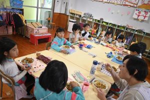 年少さんは前日にお芋をしっかりと洗い、当日年中組さんは玉ねぎをむき、年長さんはカレーに入れる玉ねぎと人参を切りました。