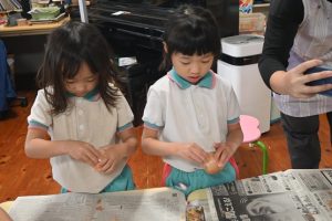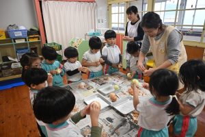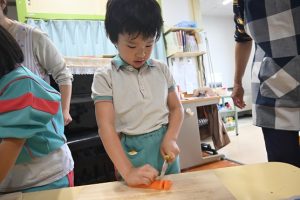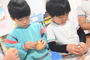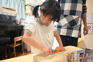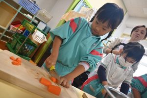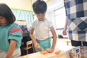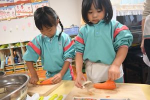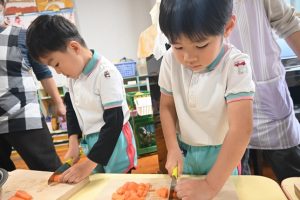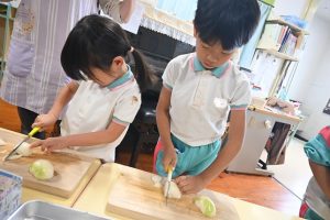 年少さんは前日にお芋をしっかりと洗い、当日年中組さんは玉ねぎをむき、年長さんはカレーに入れる玉ねぎと人参を切りました。