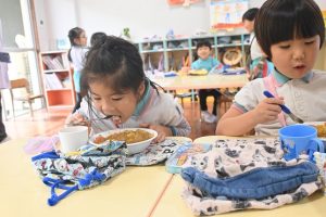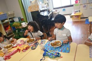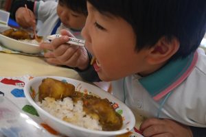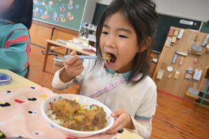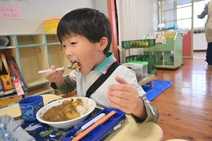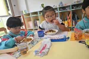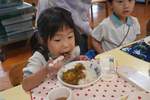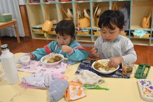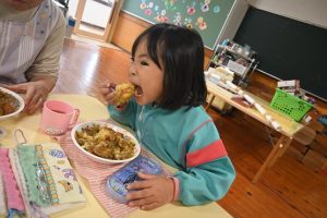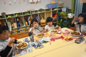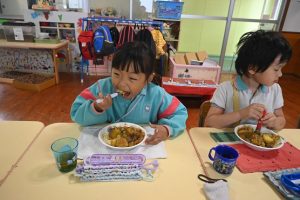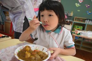 乳児組の給食もこの日はみんなで収穫したさつま芋入りのカレーでした。乳児さんはいつも通りの食べやすい大きさのさつま芋でカレーを給食で作ってもらいました。