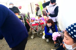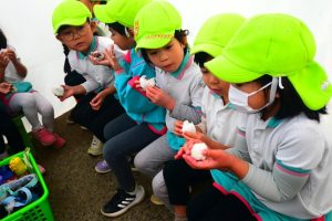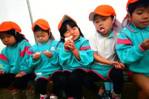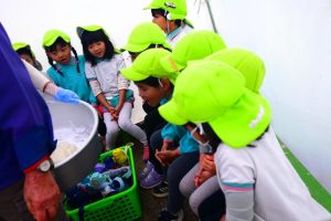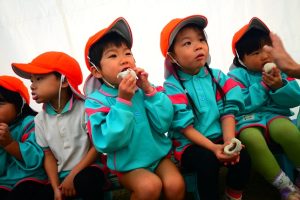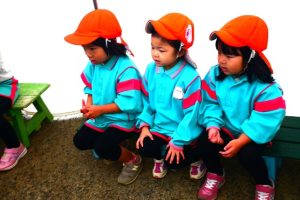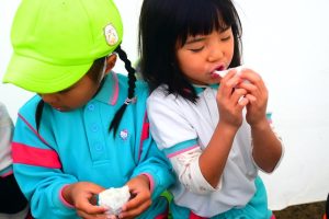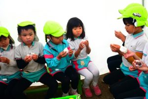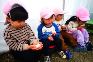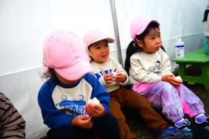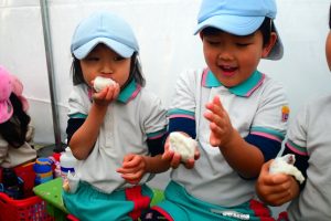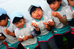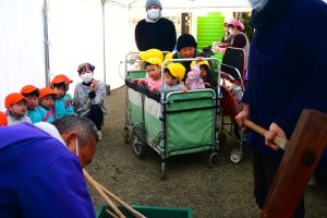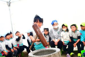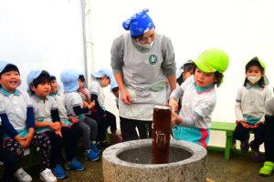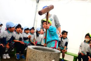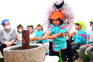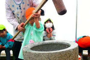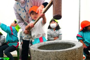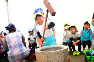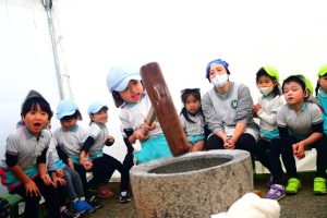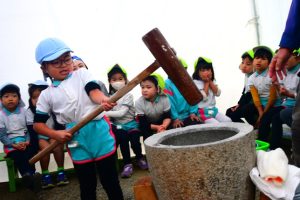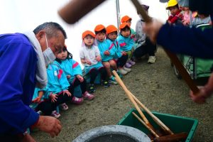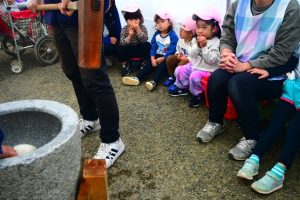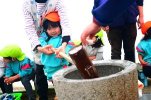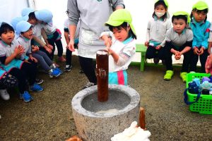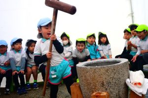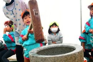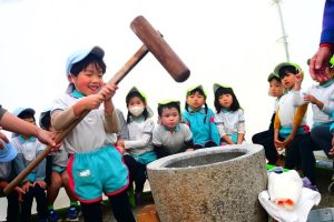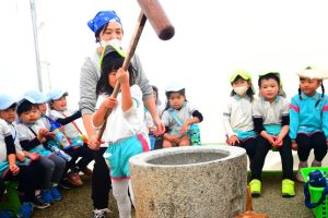 もち米を蒸し器で蒸し、石うすで杵を持って餅をつくという昔ならではの伝統的なお餅つきの年末風景があまり見られなくなった今、子ども達と一緒にこうしてお餅つきを行うことは貴重な体験だと思っています。3,4,5歳児は一人ずつ杵をもってお餅をつく経験もしました!