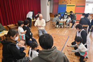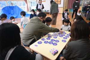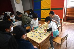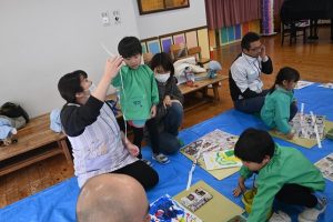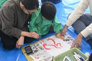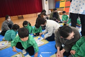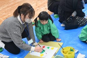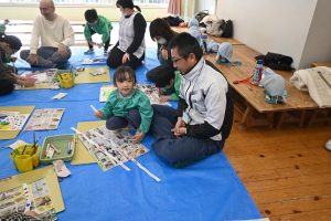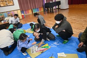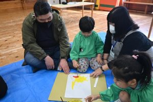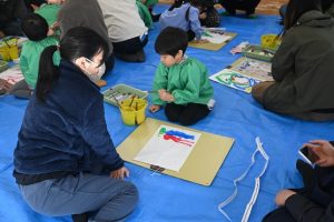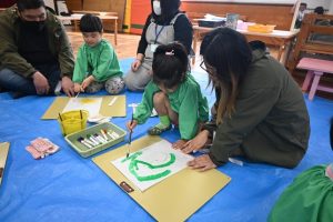 親子で凧に絵の具で絵を描いて凧を作りました。お家でどんな凧にするのかを前もって相談して来ていたので、しっぽの色塗りも含めて、お家の方も一緒に描き仕上げていきました。