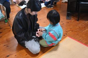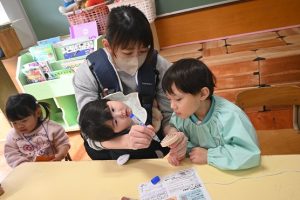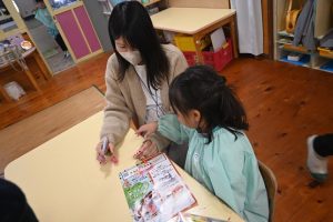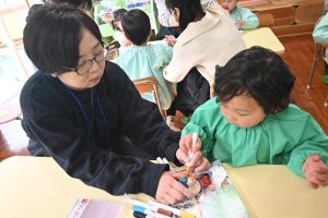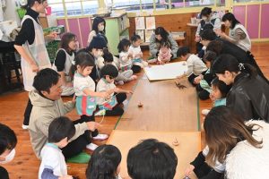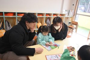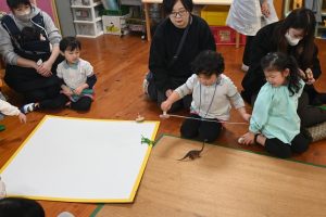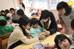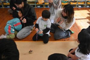 年少組の参観日は親子で引きごまの色付けを行いました。大好きなお父さんやお母さんと一緒にコマに色をぬったり一緒に回してみたり…とっても嬉しそうな子どもたちでした!