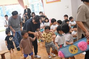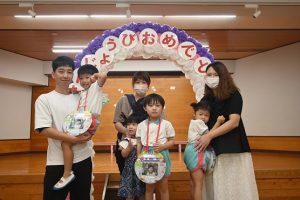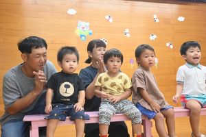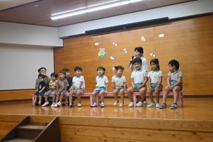 もも組。すみれ組。さくら組さんはお家の方からお祝いのメッセージ、園長先生から誕生ペンダントをかけてもらいました。