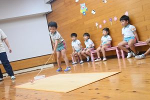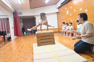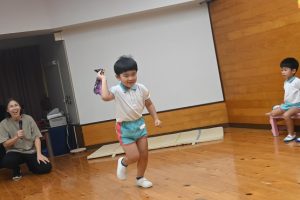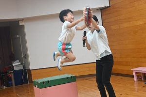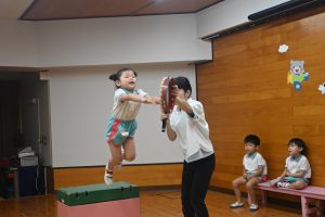 ジャンプや紙飛行機飛ばし、跳び箱、コマ回しを見せてくれました。
