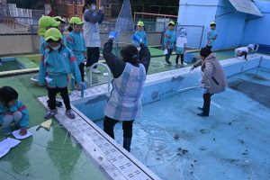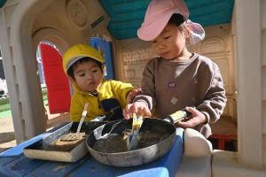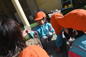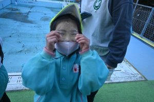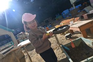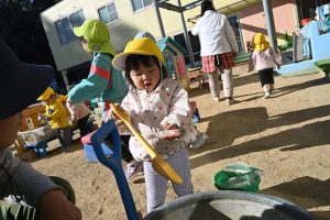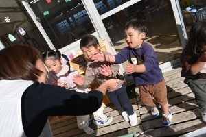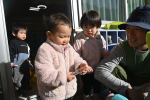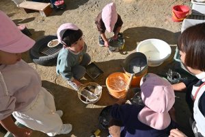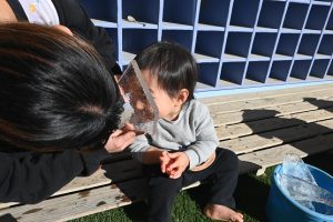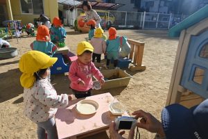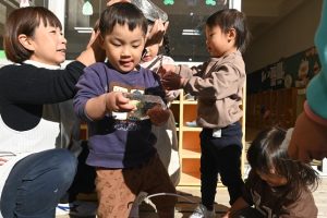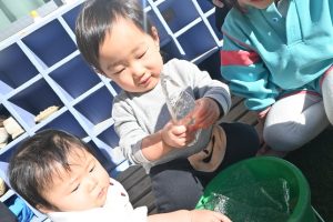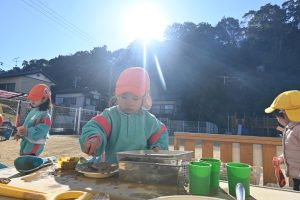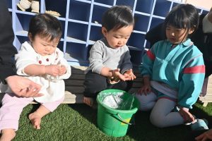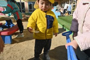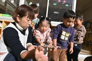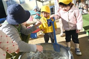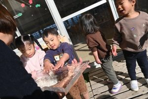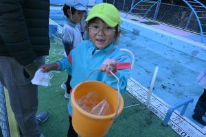 気温が下がった日にプールの水が凍っていたので、さくら組とすみれ組の子どもたちが先生と一緒に氷を取りにプールに行きました。先生がとった分厚い氷に目を輝かせながらも、その日はとても寒くて、氷を手で持ちたいけど冷たすぎて大変でした。たくさんの氷をバケツに集めて、小さいクラスの子ども達にも持っていき、見せてあげたり、日当たりのいい場所に行き、氷を陽の光に当てて眺めたり、割れた氷をごちそうにしたりして遊びました。