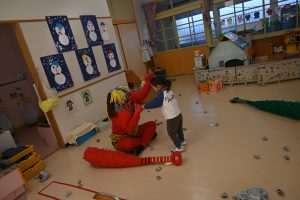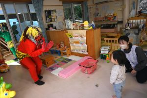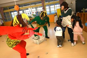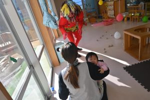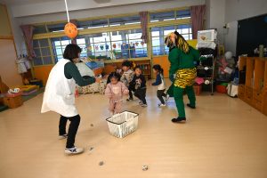0,1,2歳児クラスのお部屋に緑鬼と赤鬼がきました。