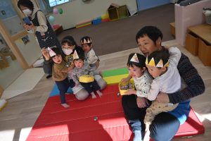 頑張って豆まきをするつもりで意気込んでいたいちご組さんもいざ大きな鬼が来るとびっくりして泣いていましたが、頑張って豆をまき、最後は仲直りしてお友達になりました😊