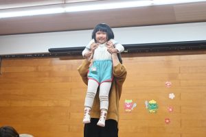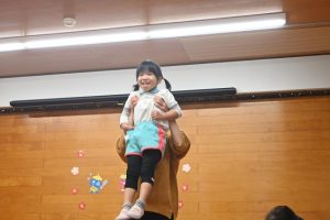 一人ずつの名前入りで誕生日の歌を歌ってもらい、先生に高く持ち上げてもらいます。