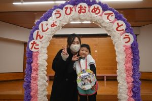 お家の方にお祝いのメッセージをいただいて一緒にハイポーズ!