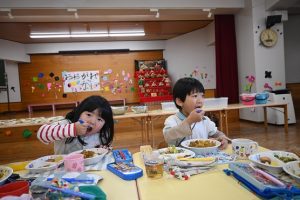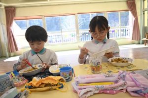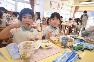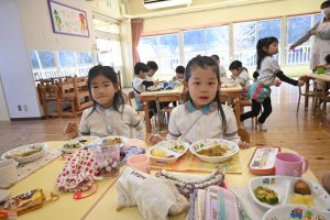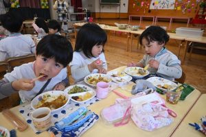 さくら組、すみれ組、もも組一緒に給食!
